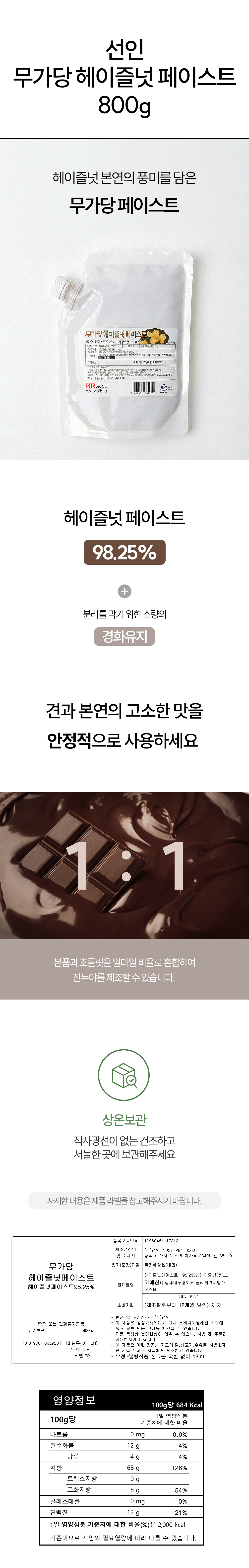 | 원재료명 및 함량 | 헤이즐넛페이스트 98.25%, 정제대두경화유, 글리세린지방산에스테르 |